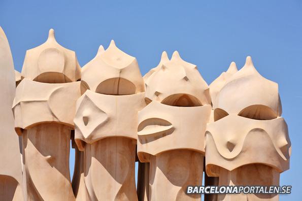 Abstrakta skulpturer på taket La Pedrera (Milà House) i Barcelona, Spanien. Skapades av Antonio Gaudi. Dessa skulpturer är skorstenar i hyreshuset.